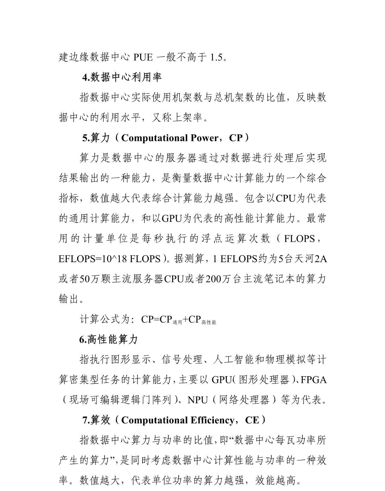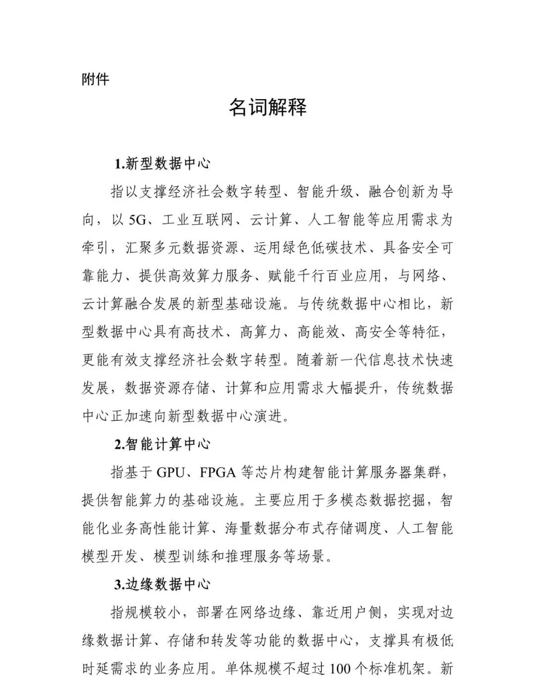 新型數(shù)據(jù)中心發(fā)展三年行動計(jì)劃 新型數(shù)據(jù)中心是以支撐經(jīng)濟(jì)社會數(shù)字轉(zhuǎn)型、智能升級、融合創(chuàng)新為導(dǎo)向,以5G、工業(yè)互聯(lián)網(wǎng)、云計(jì)算、人工智能等應(yīng)用需求為牽引,匯聚多元數(shù)據(jù)資源、運(yùn)用綠色低碳技術(shù)、具備安全可靠能力、提供高效算力服務(wù)、賦能千行百業(yè)應(yīng)用的新型基礎(chǔ)設(shè)施,具有高技術(shù)、高算力、高能效、高安全特征。隨著新一代信息技術(shù)快速發(fā)展,數(shù)據(jù)資源存儲、計(jì)算和應(yīng)用需求大幅提升,傳統(tǒng)數(shù)據(jù)中心正加速與網(wǎng)絡(luò)、云計(jì)算融合發(fā)展,加快向新型數(shù)據(jù)中心演進(jìn)。為統(tǒng)籌推進(jìn)新型數(shù)據(jù)中心發(fā)展,構(gòu)建以新型數(shù)據(jù)中心為核心的智能算力生態(tài)體系,發(fā)揮對數(shù)字經(jīng)濟(jì)的賦能和驅(qū)動作用,制定本行動計(jì)劃。 以習(xí)近平新時(shí)代中國特色社會主義思想為指導(dǎo),全面貫徹黨的十九大和十九屆二中、三中、四中、五中全會精神,把握新發(fā)展階段、貫徹新發(fā)展理念、構(gòu)建新發(fā)展格局,以賦能數(shù)字經(jīng)濟(jì)發(fā)展為目標(biāo),推動新型數(shù)據(jù)中心建設(shè)布局優(yōu)化、網(wǎng)絡(luò)質(zhì)量提升、算力賦能加速、產(chǎn)業(yè)鏈穩(wěn)固增強(qiáng)、綠色低碳發(fā)展、安全保障提高,打造新型智能算力生態(tài)體系,有效支撐各領(lǐng)域數(shù)字化轉(zhuǎn)型,為經(jīng)濟(jì)社會高質(zhì)量發(fā)展提供新動能。 統(tǒng)籌協(xié)調(diào),均衡有序。堅(jiān)持系統(tǒng)觀念,統(tǒng)籌存量和增量,加強(qiáng)數(shù)據(jù)中心規(guī)劃協(xié)調(diào),避免低質(zhì)量、粗放型建設(shè)發(fā)展。提升數(shù)據(jù)中心整體利用率,實(shí)現(xiàn)全國數(shù)據(jù)中心科學(xué)布局、有序發(fā)展。 需求牽引,深化協(xié)同。堅(jiān)持市場需求導(dǎo)向,建用并舉。推動新型數(shù)據(jù)中心與網(wǎng)絡(luò)協(xié)同建設(shè),推進(jìn)新型數(shù)據(jù)中心集群與邊緣數(shù)據(jù)中心協(xié)同聯(lián)動,促進(jìn)算力資源協(xié)同利用,加強(qiáng)國際國內(nèi)數(shù)據(jù)中心協(xié)同發(fā)展。 分類引導(dǎo),互促互補(bǔ)。堅(jiān)持多元主體共建原則,鼓勵不同主體在新型數(shù)據(jù)中心建設(shè)運(yùn)營中發(fā)揮各自優(yōu)勢,推動基礎(chǔ)電信企業(yè)強(qiáng)化網(wǎng)絡(luò)等基礎(chǔ)設(shè)施建設(shè),引導(dǎo)第三方數(shù)據(jù)中心企業(yè)提供差異化、特色化服務(wù),支持互聯(lián)網(wǎng)企業(yè)創(chuàng)新行業(yè)應(yīng)用。 創(chuàng)新驅(qū)動,產(chǎn)業(yè)升級。堅(jiān)持產(chǎn)業(yè)基礎(chǔ)高級化和產(chǎn)業(yè)鏈現(xiàn)代化,加強(qiáng)新型數(shù)據(jù)中心核心技術(shù)研發(fā),推動產(chǎn)業(yè)鏈協(xié)同創(chuàng)新,育龍頭、筑基礎(chǔ)、強(qiáng)集群,促進(jìn)產(chǎn)業(yè)發(fā)展水平和服務(wù)能力不斷提升。 綠色低碳,安全可靠。堅(jiān)持綠色發(fā)展理念,支持綠色技術(shù)、綠色產(chǎn)品、清潔能源的應(yīng)用,全面提高新型數(shù)據(jù)中心能源利用效率。統(tǒng)籌發(fā)展與安全,進(jìn)一步強(qiáng)化網(wǎng)絡(luò)和數(shù)據(jù)安全管理和能力建設(shè),構(gòu)建完善的安全保障體系。 用3年時(shí)間,基本形成布局合理、技術(shù)先進(jìn)、綠色低碳、算力規(guī)模與數(shù)字經(jīng)濟(jì)增長相適應(yīng)的新型數(shù)據(jù)中心發(fā)展格局。總體布局持續(xù)優(yōu)化,全國一體化算力網(wǎng)絡(luò)國家樞紐節(jié)點(diǎn)(以下簡稱國家樞紐節(jié)點(diǎn))、省內(nèi)數(shù)據(jù)中心、邊緣數(shù)據(jù)中心梯次布局。技術(shù)能力明顯提升,產(chǎn)業(yè)鏈不斷完善,國際競爭力穩(wěn)步增強(qiáng)。算力算效水平顯著提升,網(wǎng)絡(luò)質(zhì)量明顯優(yōu)化,數(shù)網(wǎng)、數(shù)云、云邊協(xié)同發(fā)展。能效水平穩(wěn)步提升,電能利用效率(PUE)逐步降低,可再生能源利用率逐步提高。 到2021年底,全國數(shù)據(jù)中心平均利用率力爭提升到55%以上,總算力超過120 EFLOPS,新建大型及以上數(shù)據(jù)中心PUE降低到1.35以下。 到2023年底,全國數(shù)據(jù)中心機(jī)架規(guī)模年均增速保持在20%左右,平均利用率力爭提升到60%以上,總算力超過200 EFLOPS,高性能算力占比達(dá)到10%。國家樞紐節(jié)點(diǎn)算力規(guī)模占比超過70%。新建大型及以上數(shù)據(jù)中心PUE降低到1.3以下,嚴(yán)寒和寒冷地區(qū)力爭降低到1.25以下。國家樞紐節(jié)點(diǎn)內(nèi)數(shù)據(jù)中心端到端網(wǎng)絡(luò)單向時(shí)延原則上小于20毫秒。 (一)新型數(shù)據(jù)中心建設(shè)布局優(yōu)化行動 1.加快建設(shè)國家樞紐節(jié)點(diǎn)。推動京津冀、長三角、粵港澳大灣區(qū)、成渝等國家樞紐節(jié)點(diǎn)適當(dāng)加快新型數(shù)據(jù)中心集群建設(shè)進(jìn)度,實(shí)現(xiàn)大規(guī)模算力部署,滿足重大區(qū)域發(fā)展戰(zhàn)略實(shí)施需要;貴州、內(nèi)蒙古、甘肅、寧夏等國家樞紐節(jié)點(diǎn)重點(diǎn)提升算力服務(wù)品質(zhì)和利用效率,打造面向全國的非實(shí)時(sh