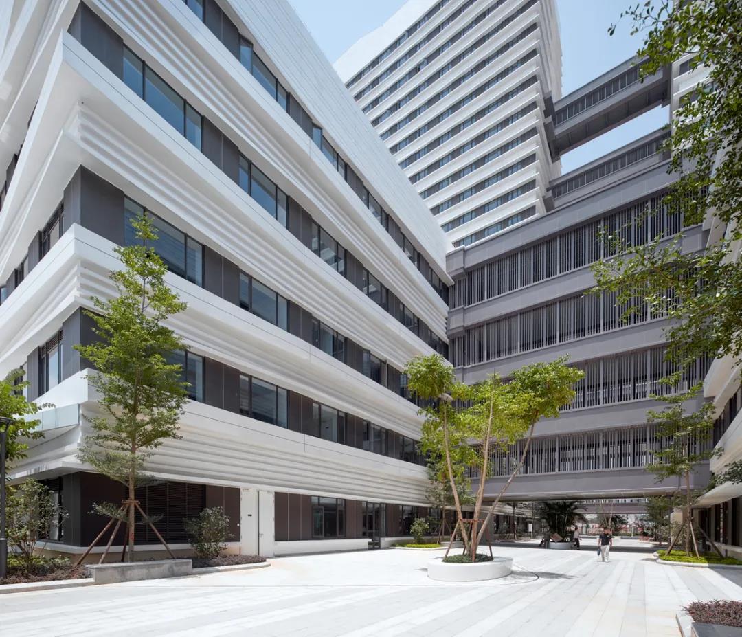 在模塊化排布和重建的基礎(chǔ)上,建筑的外立面將30多萬平方米的建筑以水平折線的幾何連接在一起,從而形成一個具有節(jié)奏感的整體外部體驗(yàn)。陽光和陰影被建筑立面的紋理所分割,使得使用者可以更關(guān)注建筑的細(xì)節(jié)以及建筑物與自身之間的關(guān)系,這種設(shè)計表明這是一個可以提供細(xì)致服務(wù)的醫(yī)療空間。