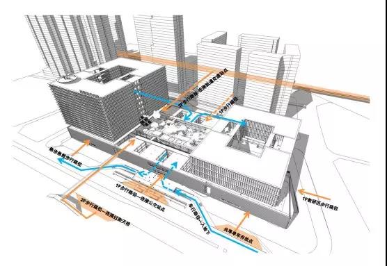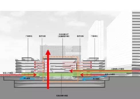 以往我們去醫院,都是去一個正門大廳,然后從大廳再去各個科室,這往往讓大廳成為人流的瓶頸。而在新華醫院,預計每天人流量有4萬人,因此把醫院打造成從四面八方都能進入的場所。