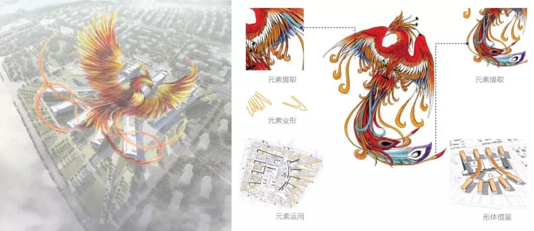 日出東方、火鳳騰飛——方案延續(xù)當?shù)貙μ柕某绨菁傍P凰城遺址的歷史文化積淀,取意象征太陽的神鳥鳳凰,將鳳凰羽翼和尾翼的線條進行提煉演變,形成建筑和景觀的構成元素,表達了對歷史和文化的呼應。