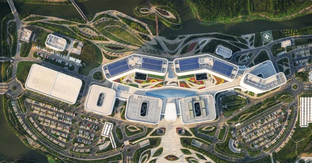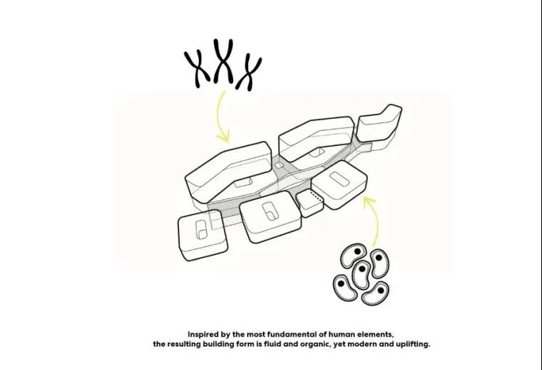 建筑的設計理念源自大自然最基本的生命元素——細胞。南側門診樓和行政樓被賦予細胞狀的外觀;北側建筑體塊的排布則模擬了細胞內染色體的形態(tài)。建筑的朝向和角度與河道景觀交相呼應,呈現(xiàn)出律動的美感。