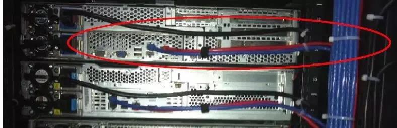 不同線纜用不同顏色的線區分,如內網線:藍色,ILO線:灰色,電源線:黑色,預留的線纜長度不宜過長,能從一側PDU到另外一側PDU即可,預留過長線纜會對理線造成影響。上下兩臺服務器之間布線及捆綁要求如下圖:(因網線有電磁干擾,要做到強弱分開,電源線與網線要分開捆扎)
